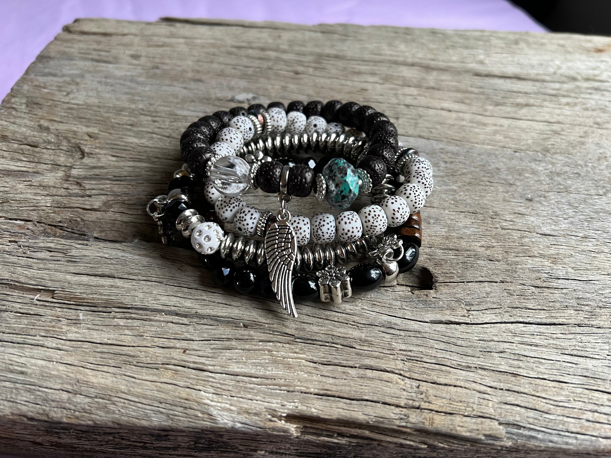 Beautiful bracelet stacks using a mix of resin and plastic light weight beads and silver or gold alloy charms