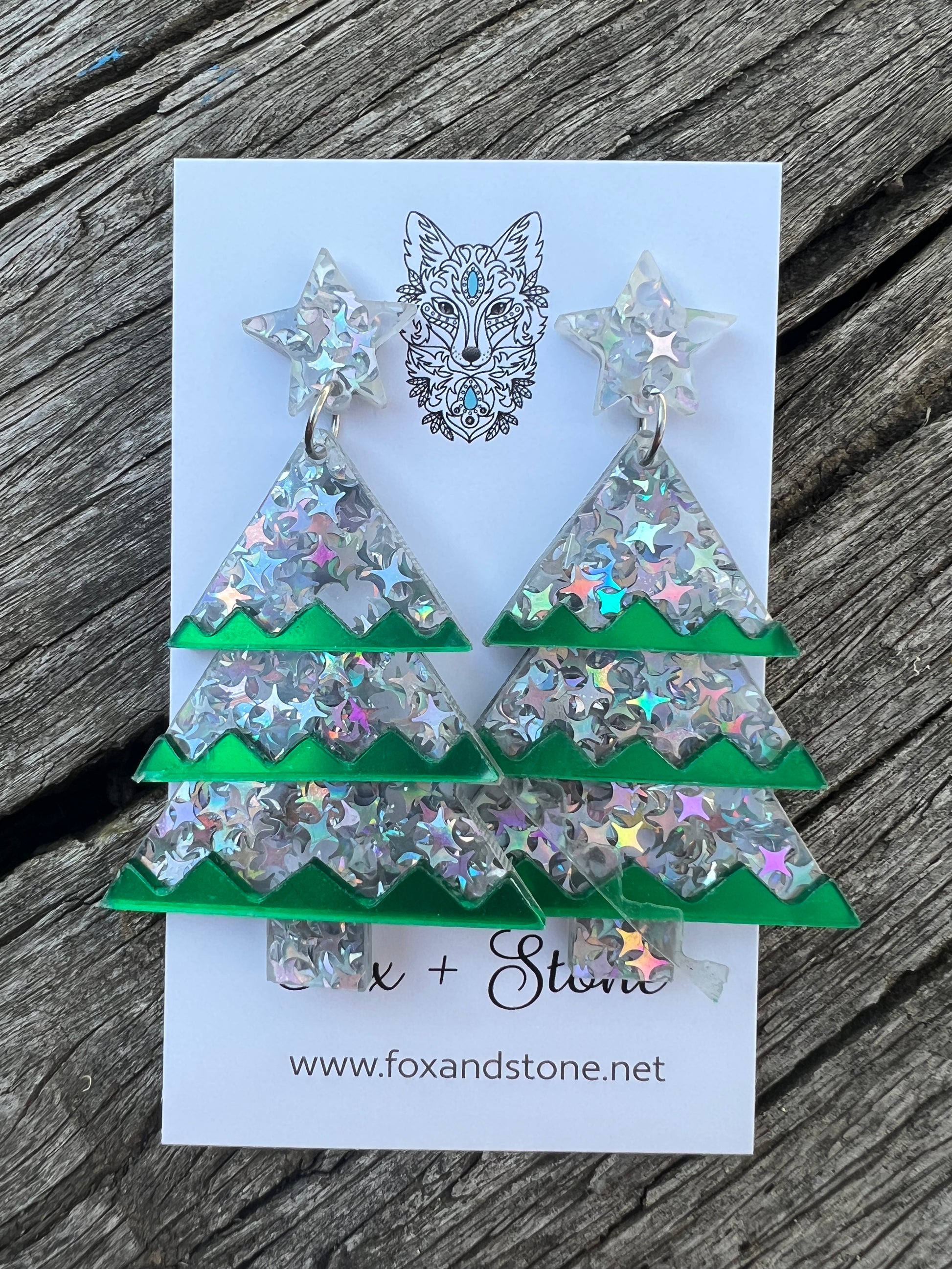 Beautiful Acrylic Mirror Xmas Tree Earrings Silver Iridescent