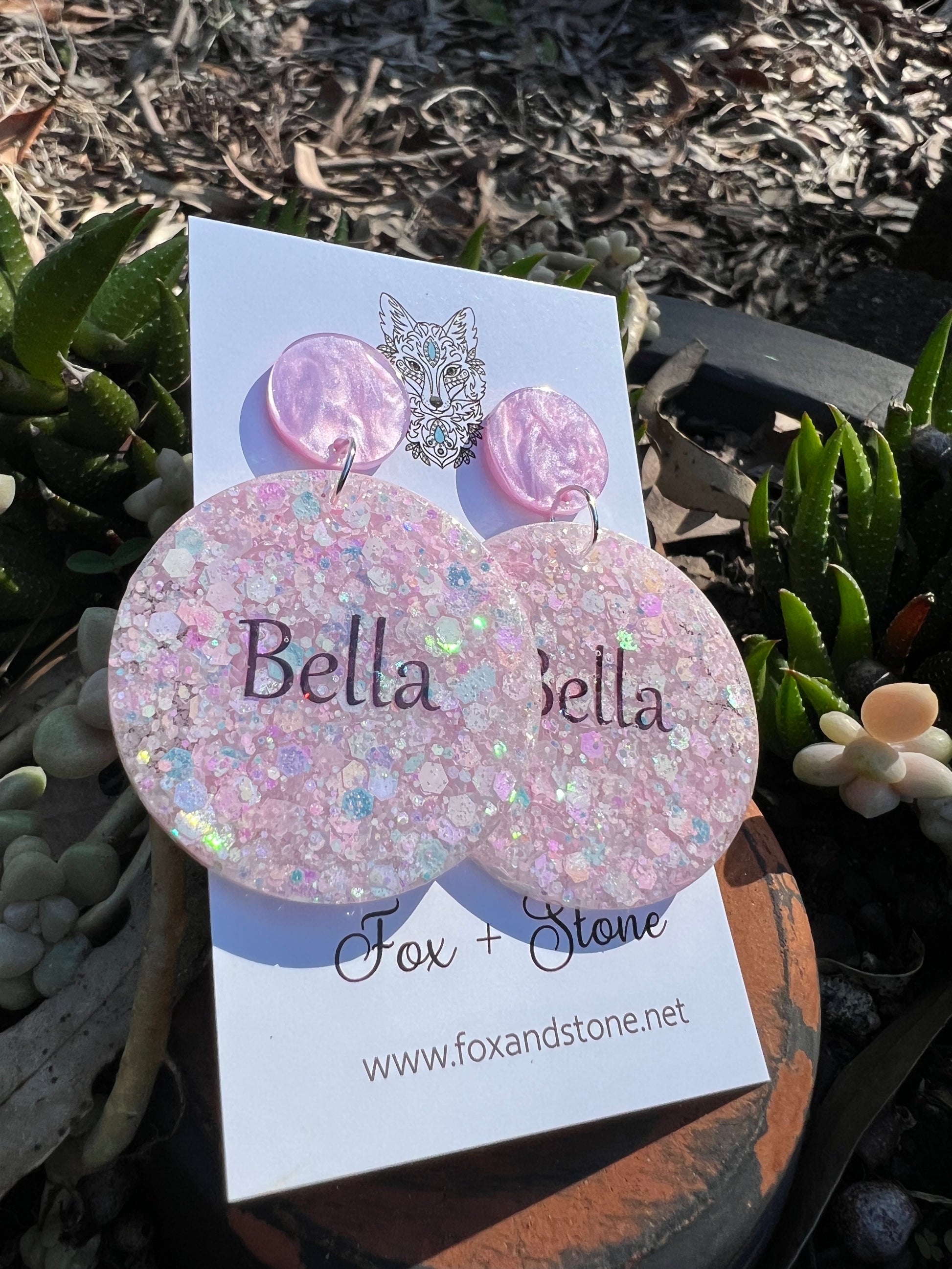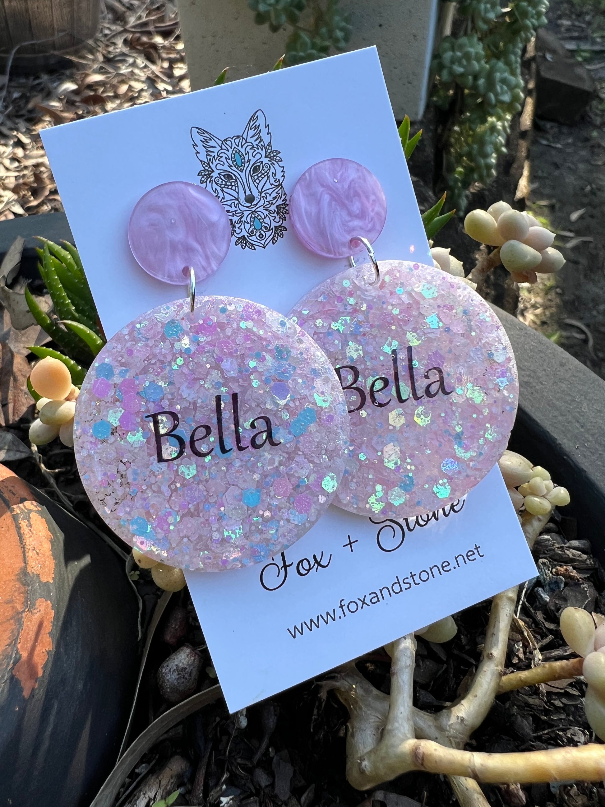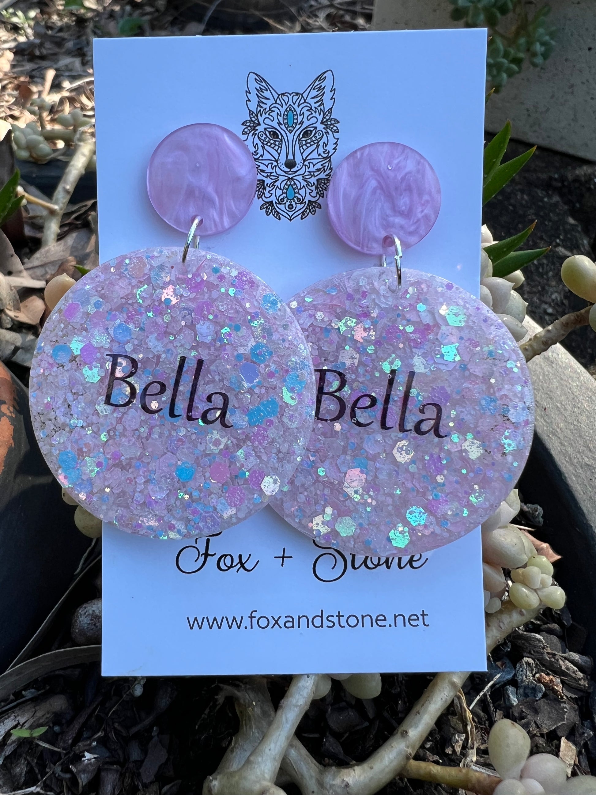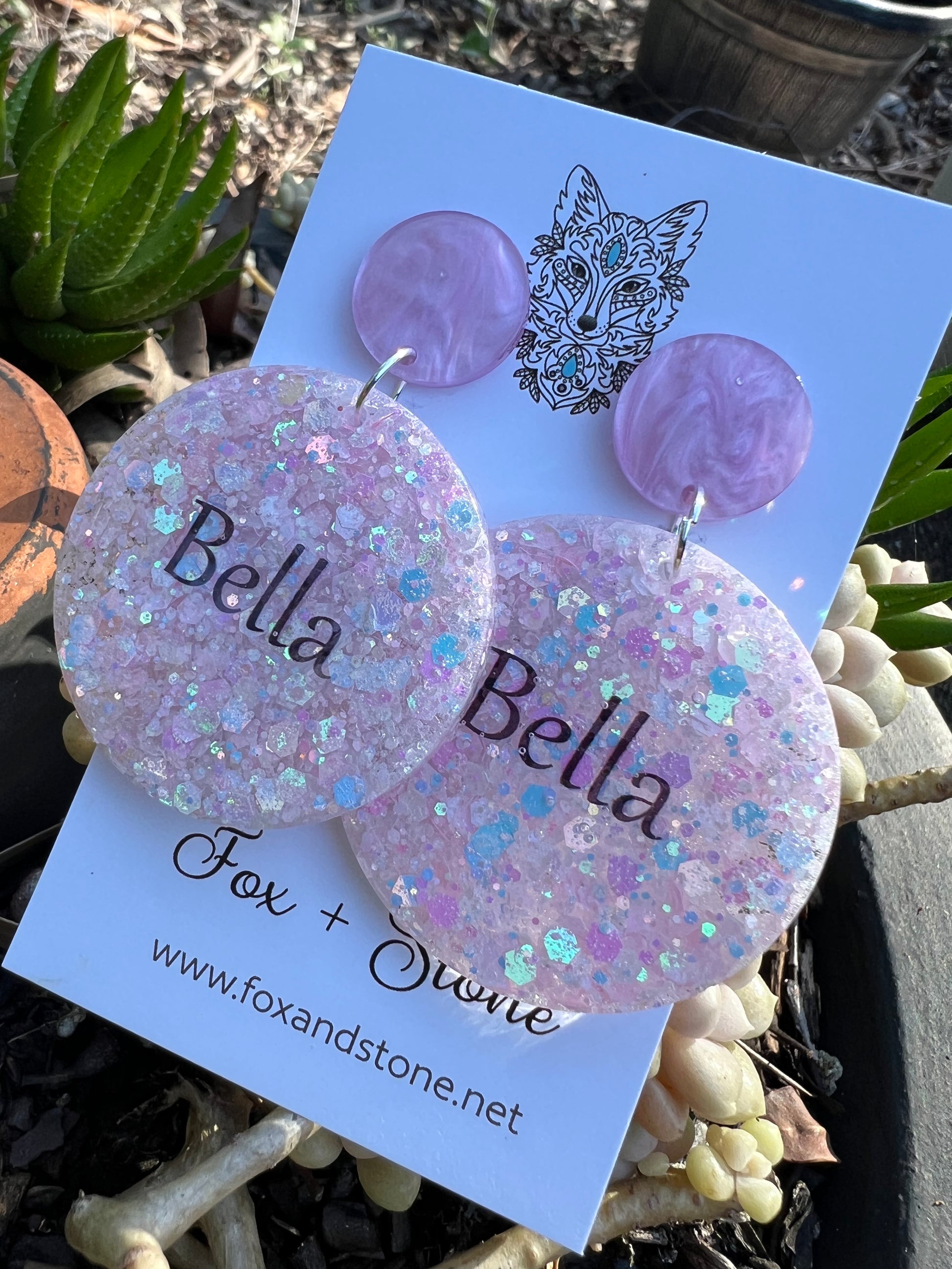 How gorgeous are these glitter dangle sparkling earrings that are custom made with the names of choice