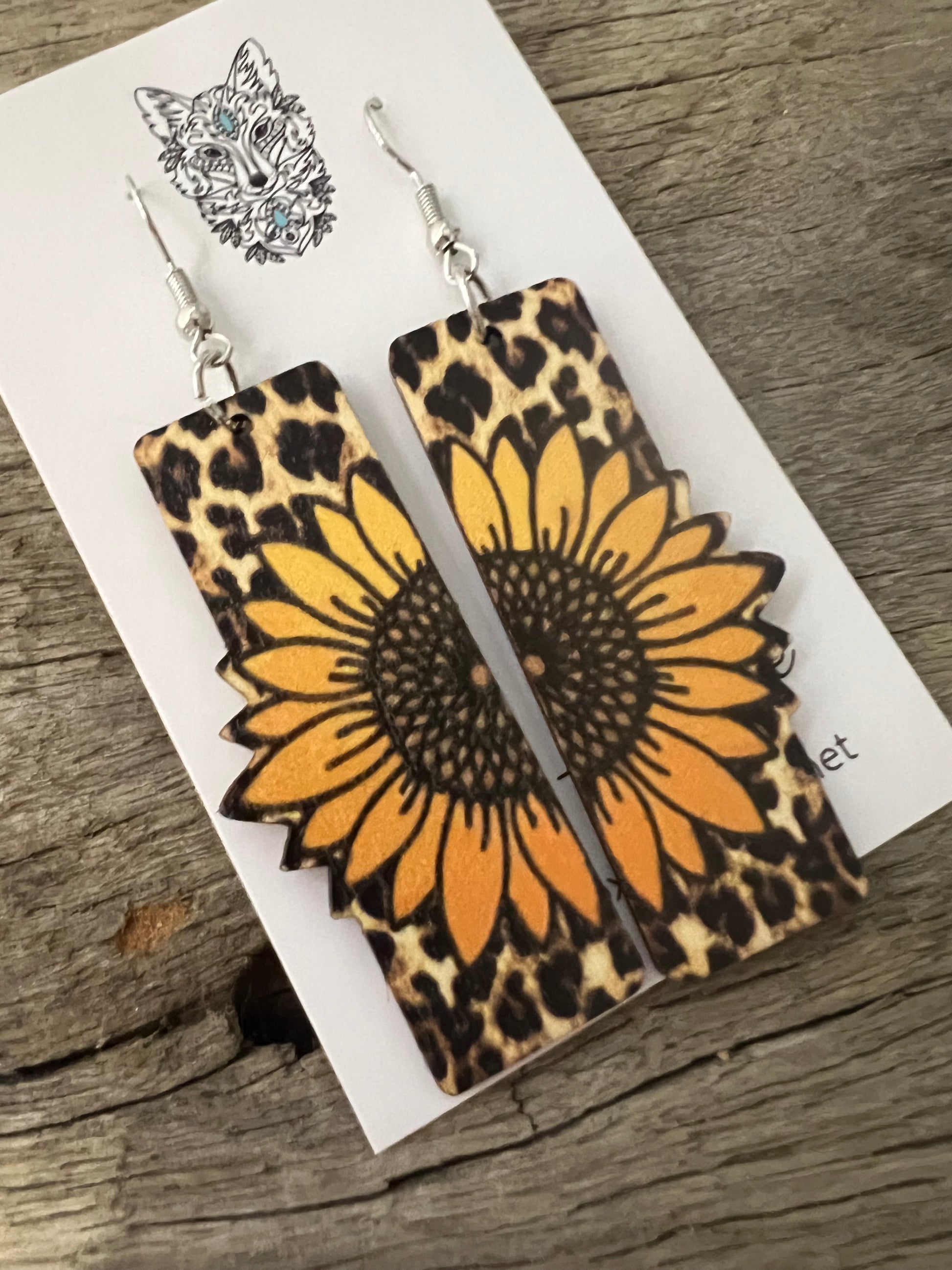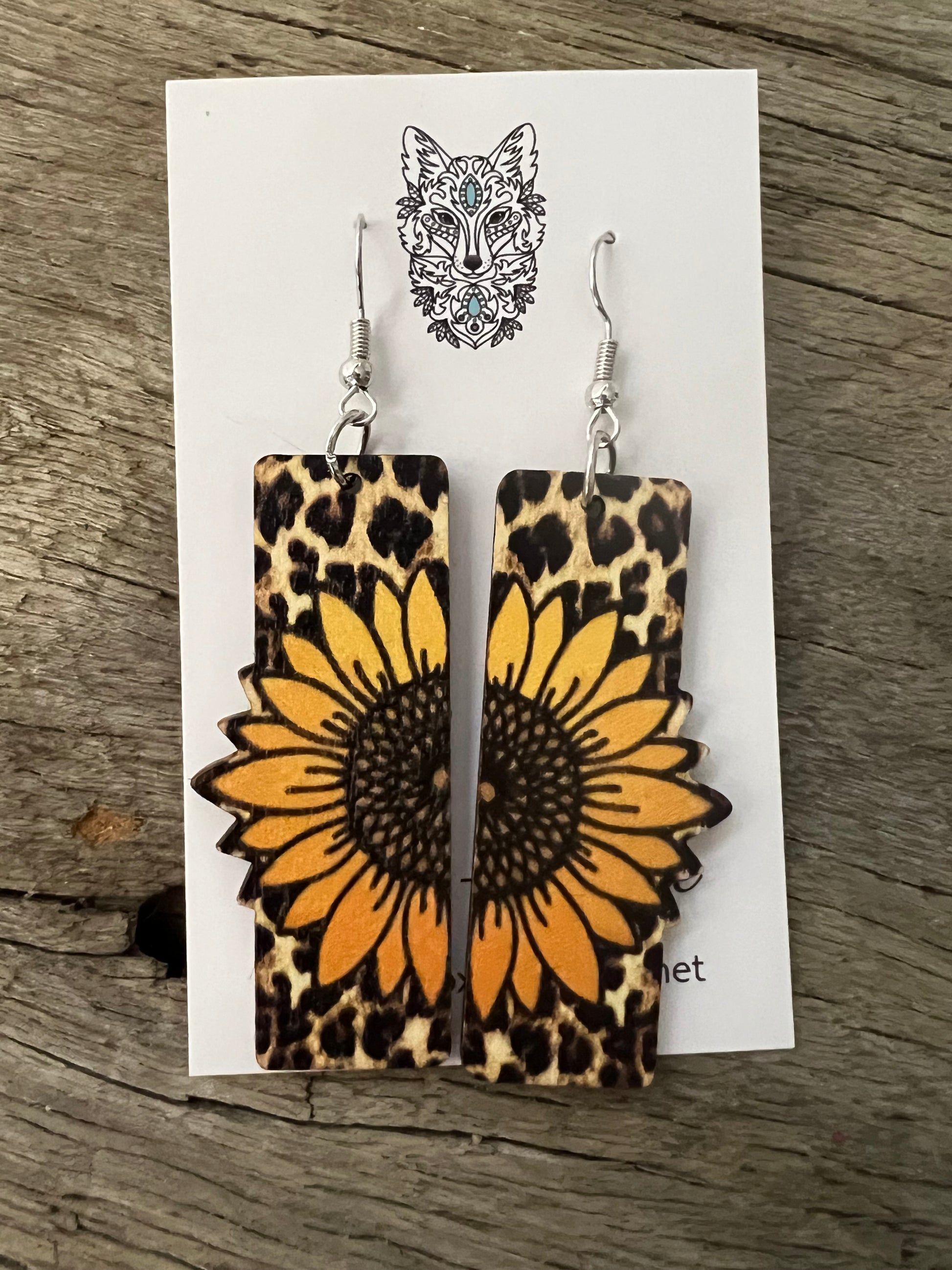 Sunflower Leopard Rectangular Natural Wood Earrings