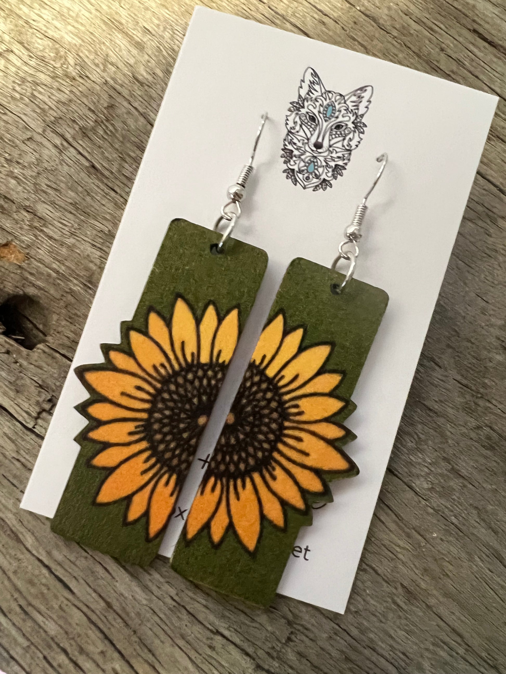 Khaki Sunflower Rectangular Natural Wood Earrings