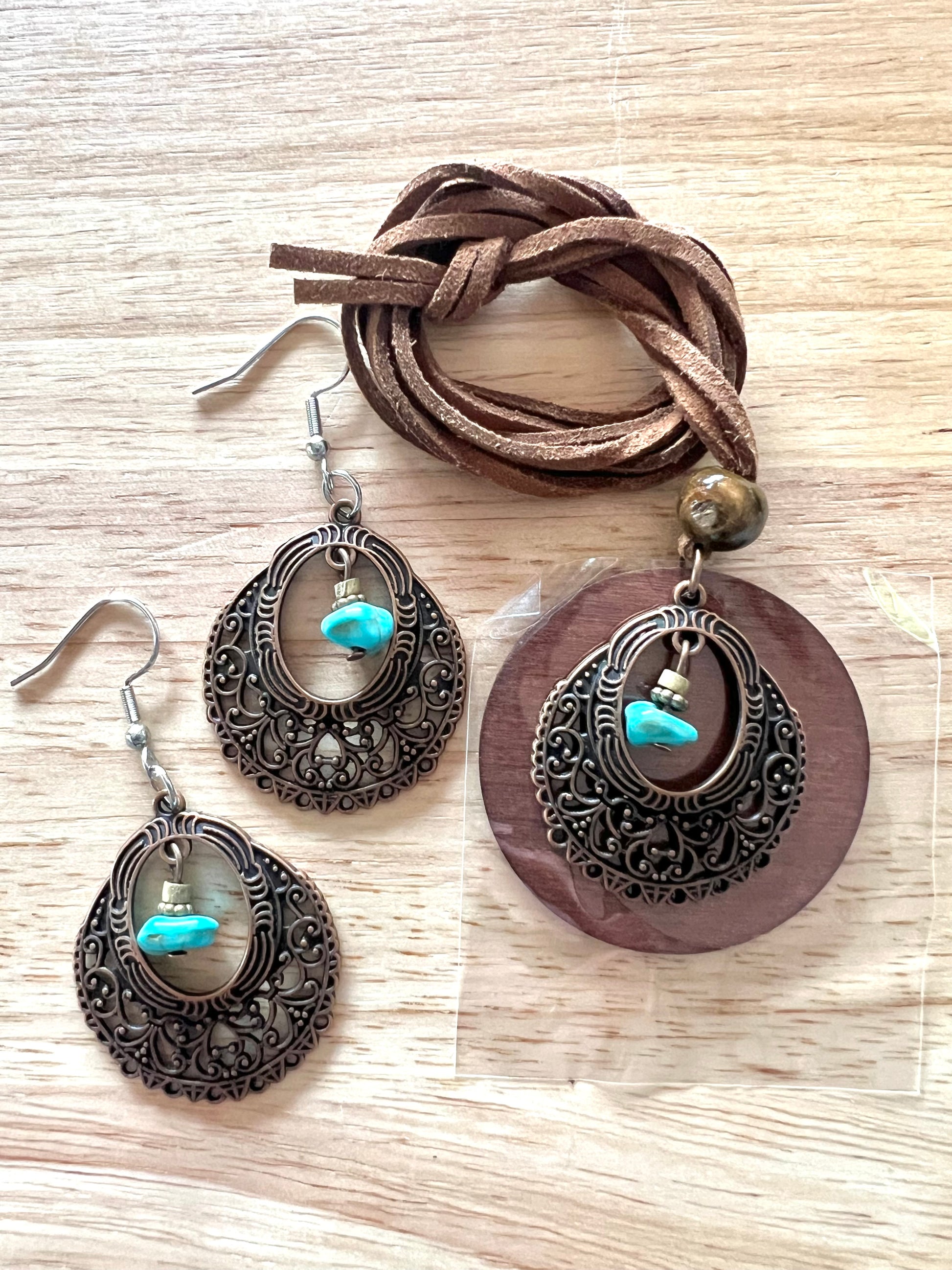 Lightweight wood and alloy metal pendant and earrings